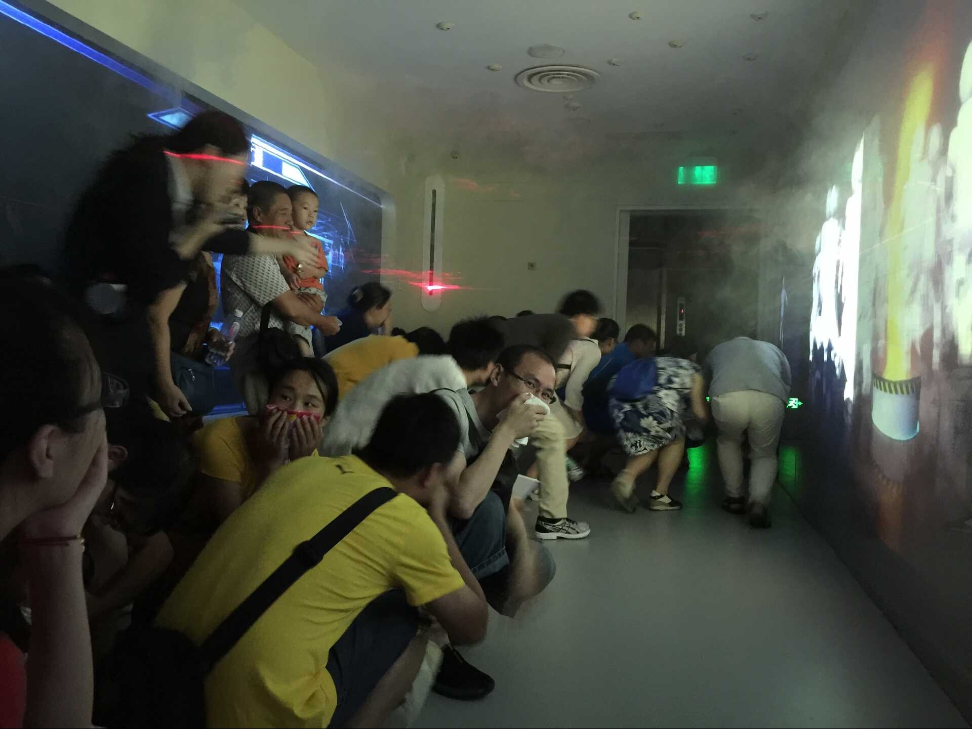 二层展馆为科技体验馆,设有“动感4D影院”、“逃生体验及临危自救”、“虚拟火灾实验室”、“燃烧实验对比视频墙”等高科技多媒体展项。导游们在参观过程中参与了逃生演练,切身体会到了了解基本的消防知识和逃生技能是极为重要的。